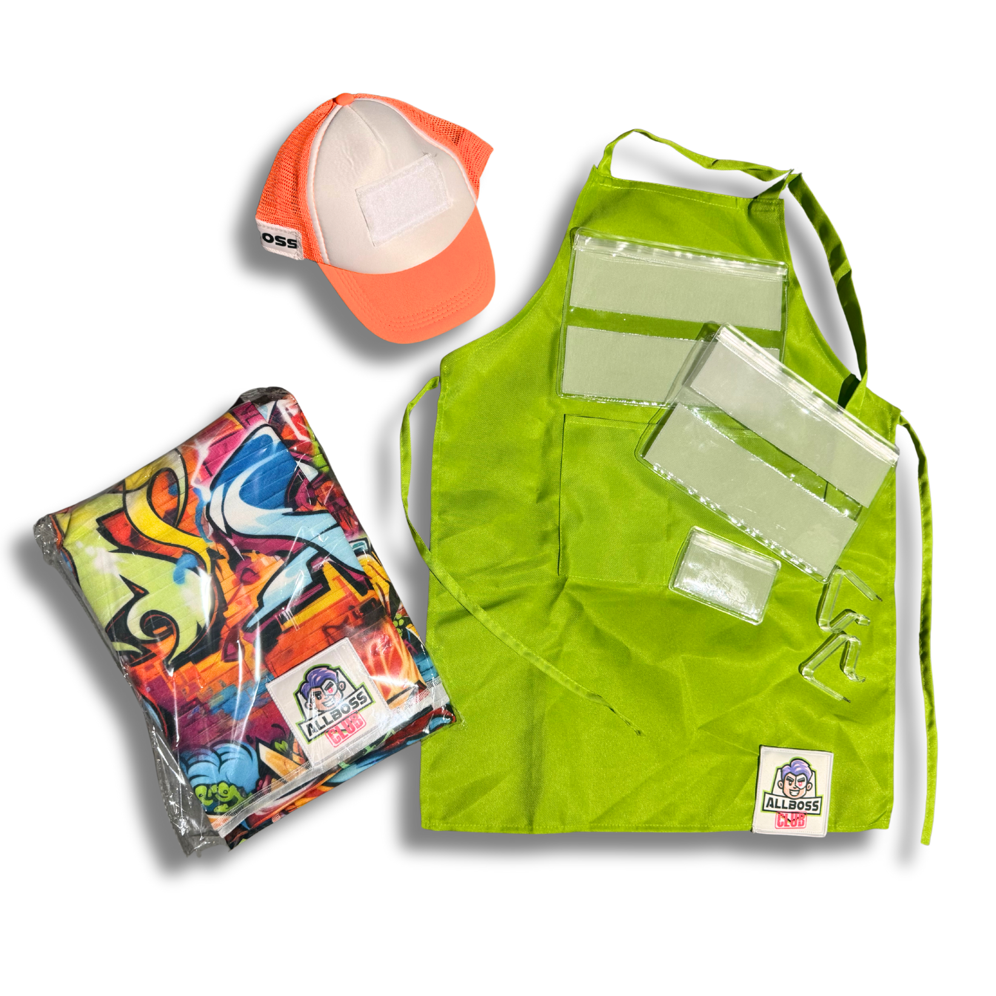 Boss Gear – A hat and apron in the Boss’s favorite colors.