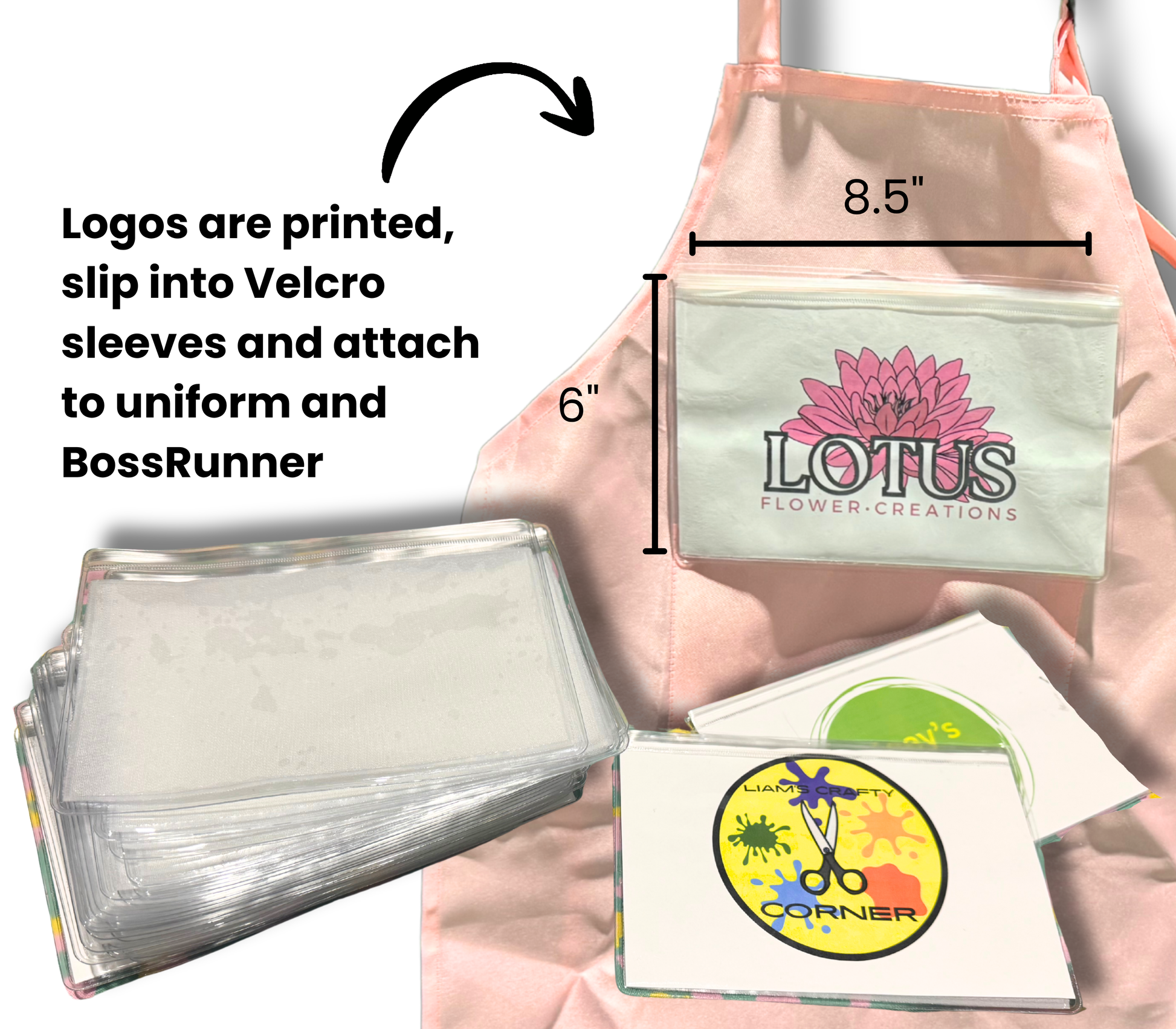 Clear Logo Sleeves (Velcro) – Two per set to showcase student-designed logos on aprons and BossRunners. Logos can be printed onsite and easily slip in and out of the sleeves allowing for the seamless sharing of materials between classes.